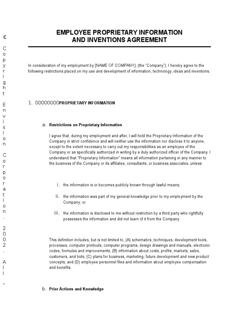 Proprietary Information And Inventions Agreement Template By Business In A Box